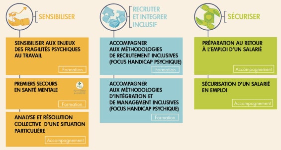 - Des formations collectives, sur des thématiques identifiées, pour faire monter en compétences vos équipes sur des enjeux clés de l’inclusion et renforcer la prise en charge de la santé mentale de vos salariés.